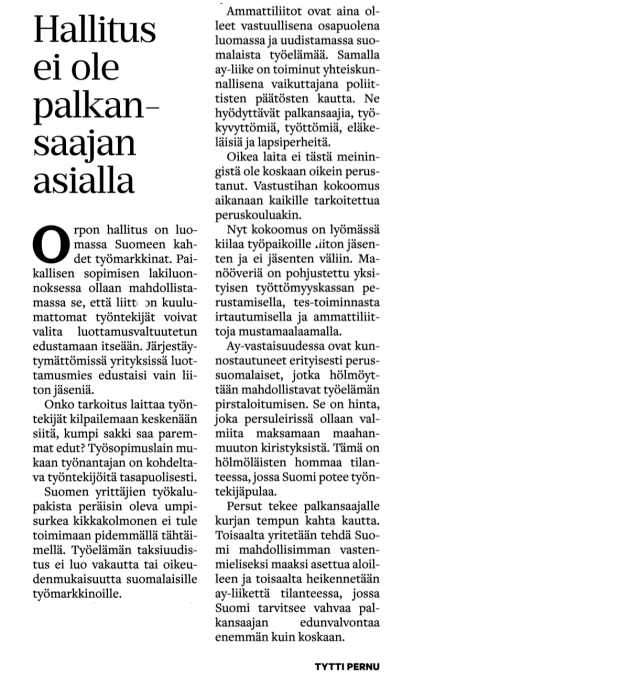 Jaa tämä artikkeli Facebook Twitter LinkedIn Edellinen artikkeli: Missä kohtaa mentiin metsään?, Tytti Pernu 28.5.2024 Lapin Kansa Seuraava artikkeli: Huolestuttavaa välinpitämättömyyttä, 10.7.2024 Lapin Kansa