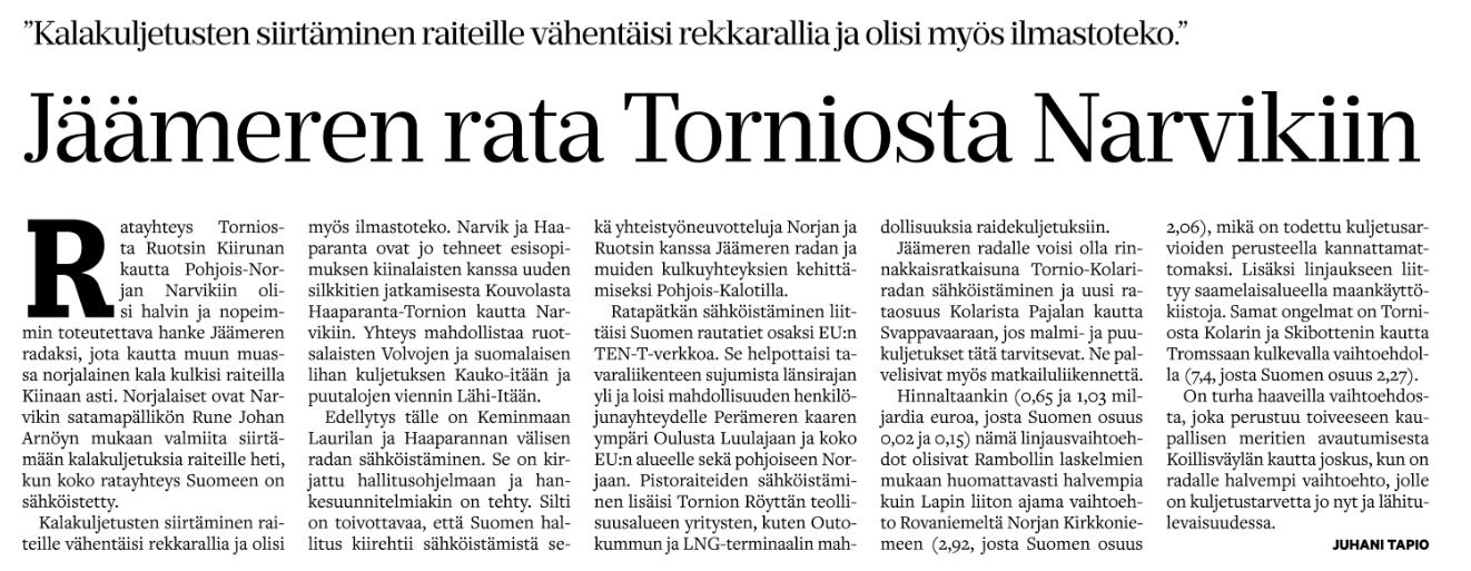 Jaa tämä artikkeli Facebook Twitter LinkedIn Edellinen artikkeli: Tornion taloustilanne huolestuttaa, Henna Knuuti 20.11.2019 Lounais-Lappi Seuraava artikkeli: Norjalaiset haluaisivat kalakuljetuksia junaan -Jäämerenrata Torniosta Narvikiin, Juhani Tapio 15.1.2020 LapinKansa
